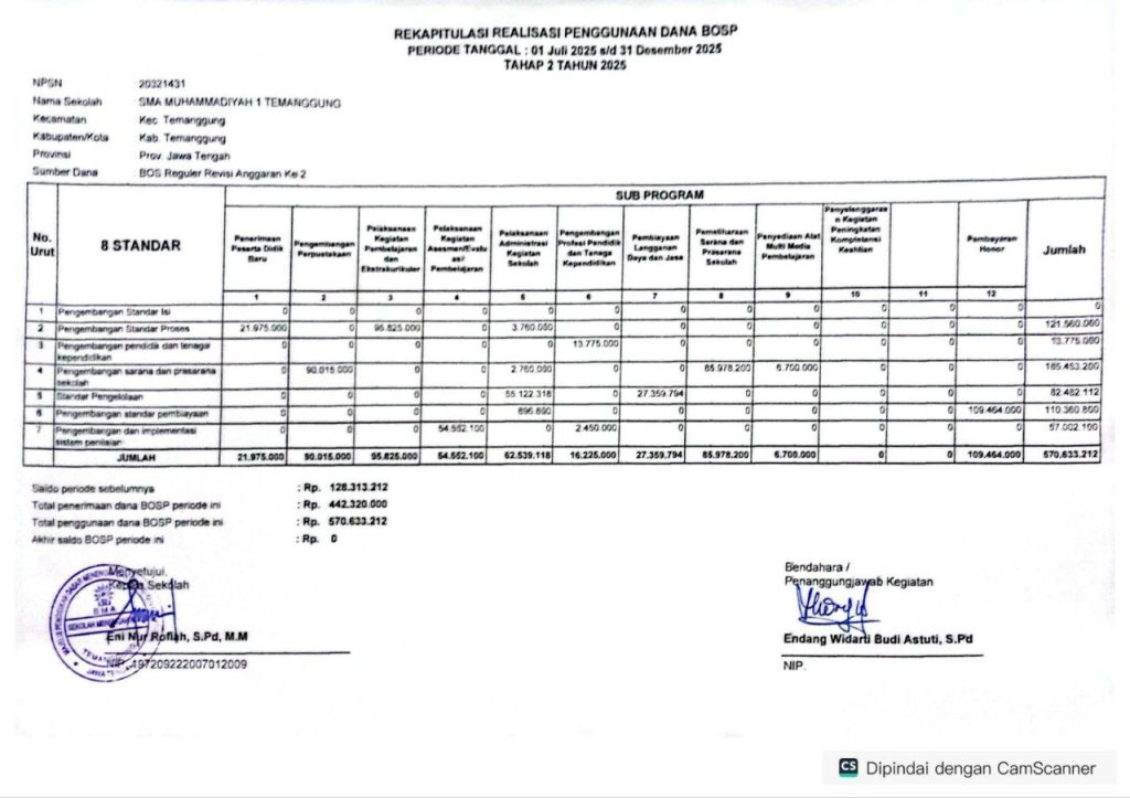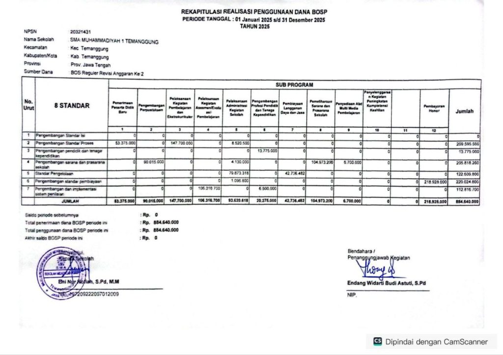 SMA Muhammadiyah 1 Temanggung menyampaikan Laporan Rekapitulasi Realisasi Penggunaan Dana BOSP Tahun Anggaran 2025 sebagai bentuk transparansi dan akuntabilitas pengelolaan keuangan sekolah. Dana BOSP tahun 2025 telah dikelola dan dimanfaatkan sesuai dengan petunjuk teknis pemerintah serta mengacu pada RKAS untuk mendukung operasional sekolah, peningkatan mutu pembelajaran, pengembangan sarana prasarana, dan peningkatan kompetensi pendidik serta tenaga kependidikan, dengan tetap menjunjung prinsip efisiensi, efektivitas, dan tanggung jawab guna meningkatkan kualitas layanan pendidikan.